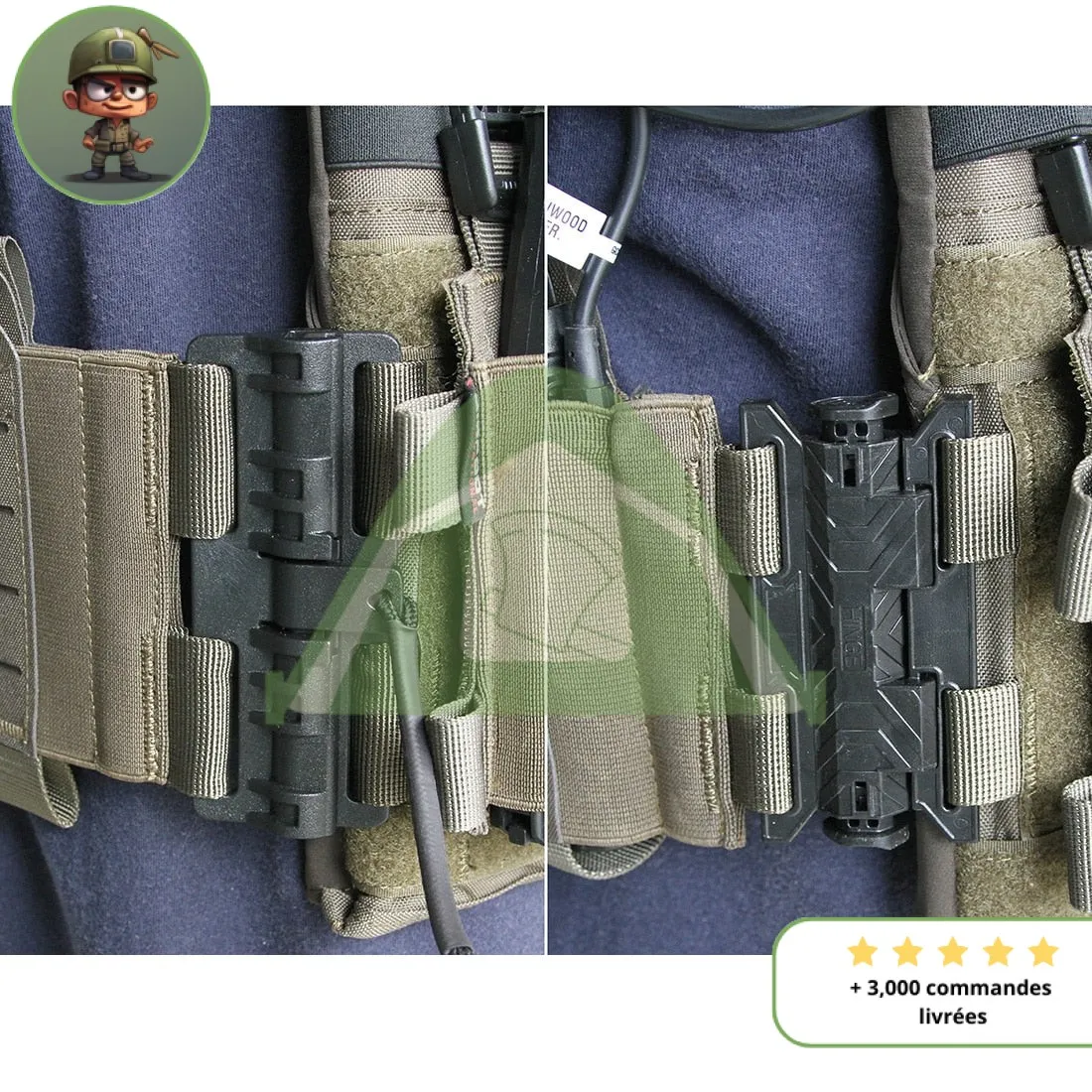 - Des multiples pochettes à l’avant pour stocker par exemple des chargeurs, des grenades, des lampes de poche ou une trousse de secours