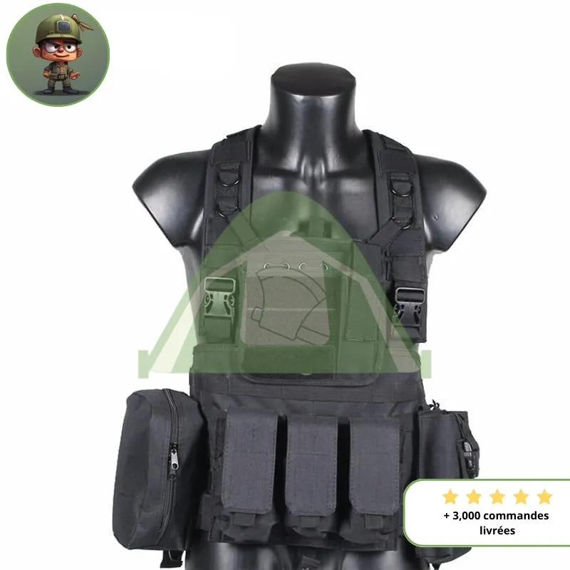 - Trois pochettes à l’avant pour stocker par exemple des chargeurs, des grenades, des lampes de poche ou une trousse de secours