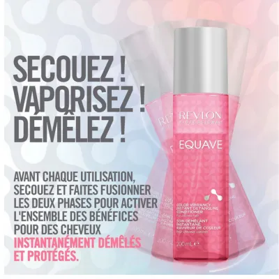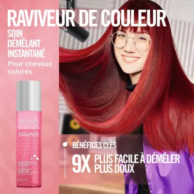 • Ce soin des cheveux a été conçu pour fixer la couleur et hydrater tout en scellant les cuticules. Le démêlant cheveux Equave de Revlon Professional Raviveur de Couleur contient des filtres UV et agit comme un primer pour les cheveux. Ainsi, ce soin cheveux devient la première étape de votre routine de soins capillaires et empêche la couleur des cheveux de s’affadir.
