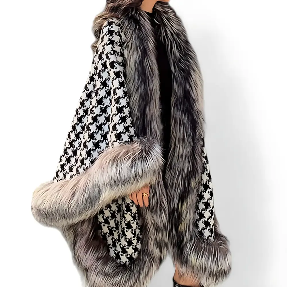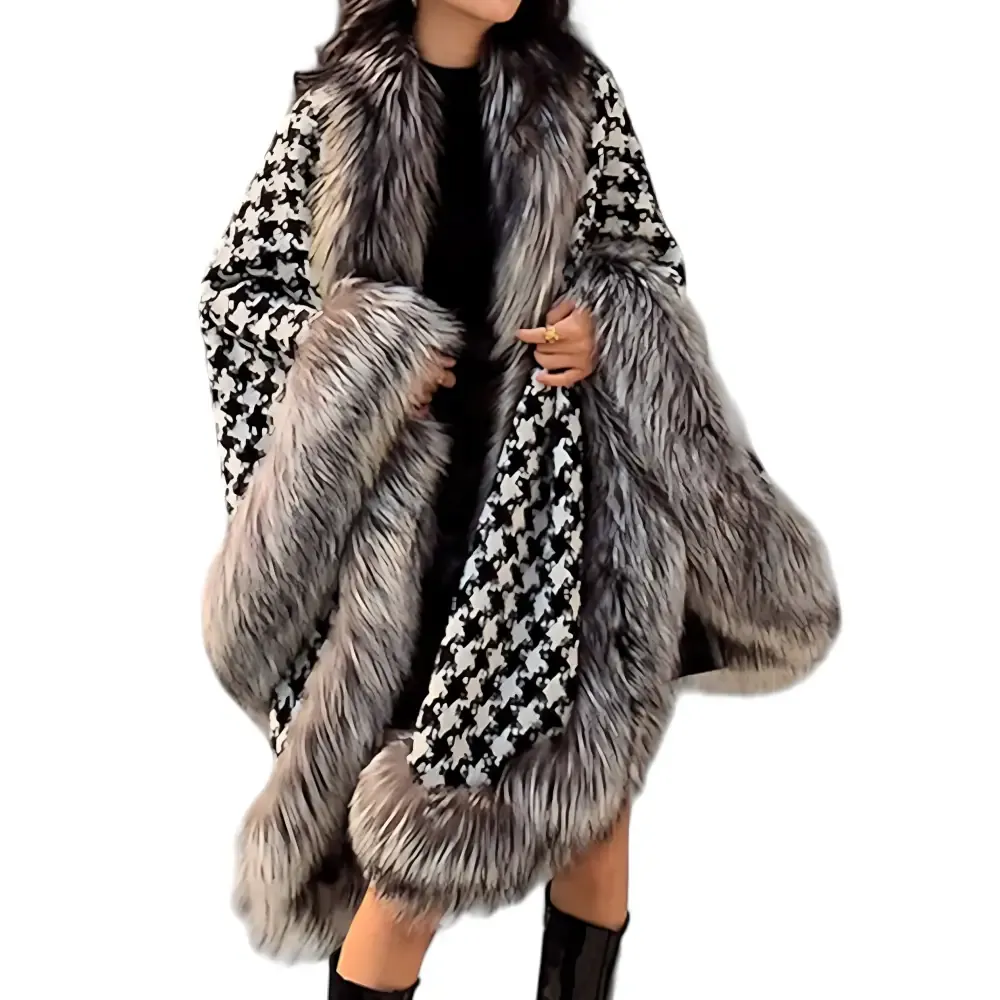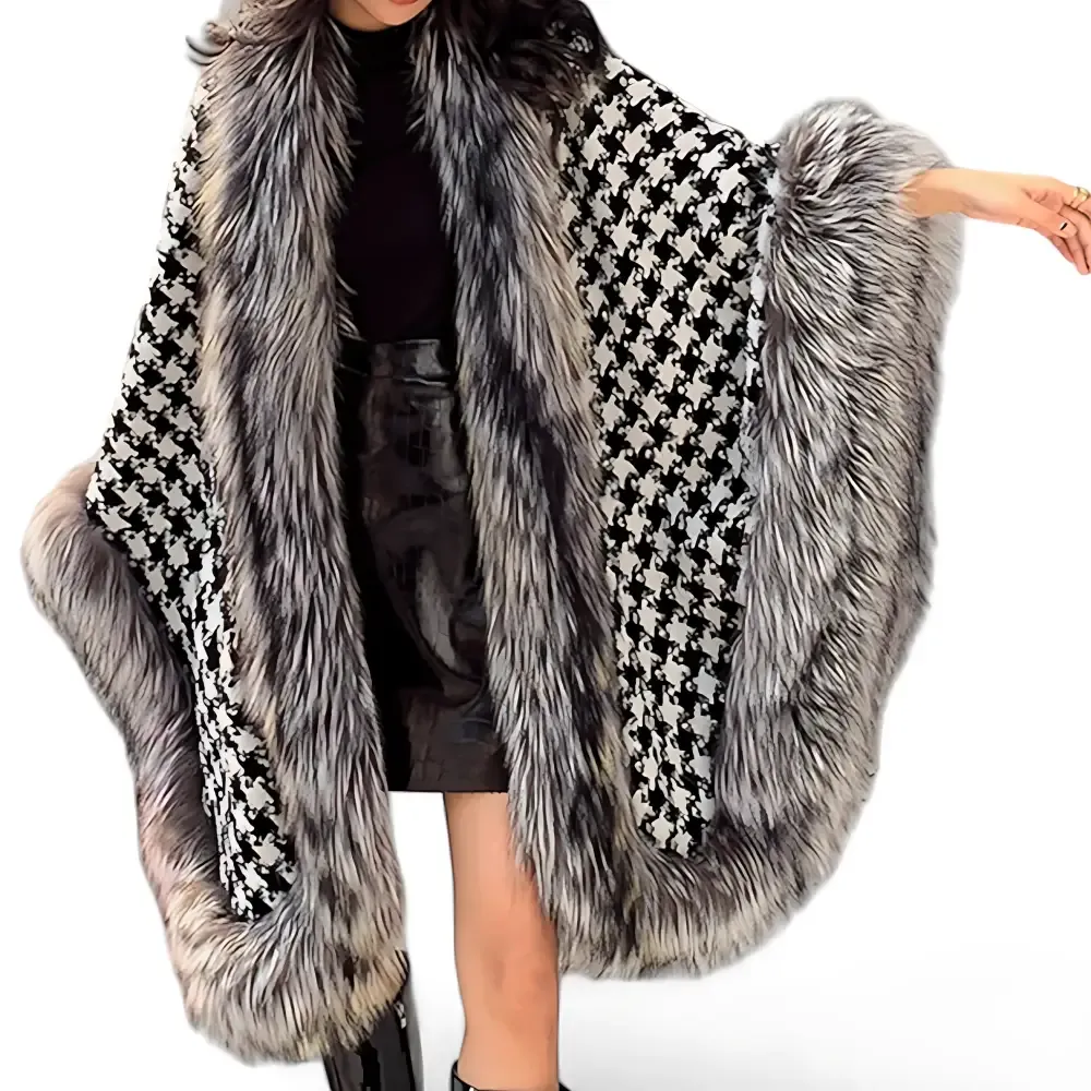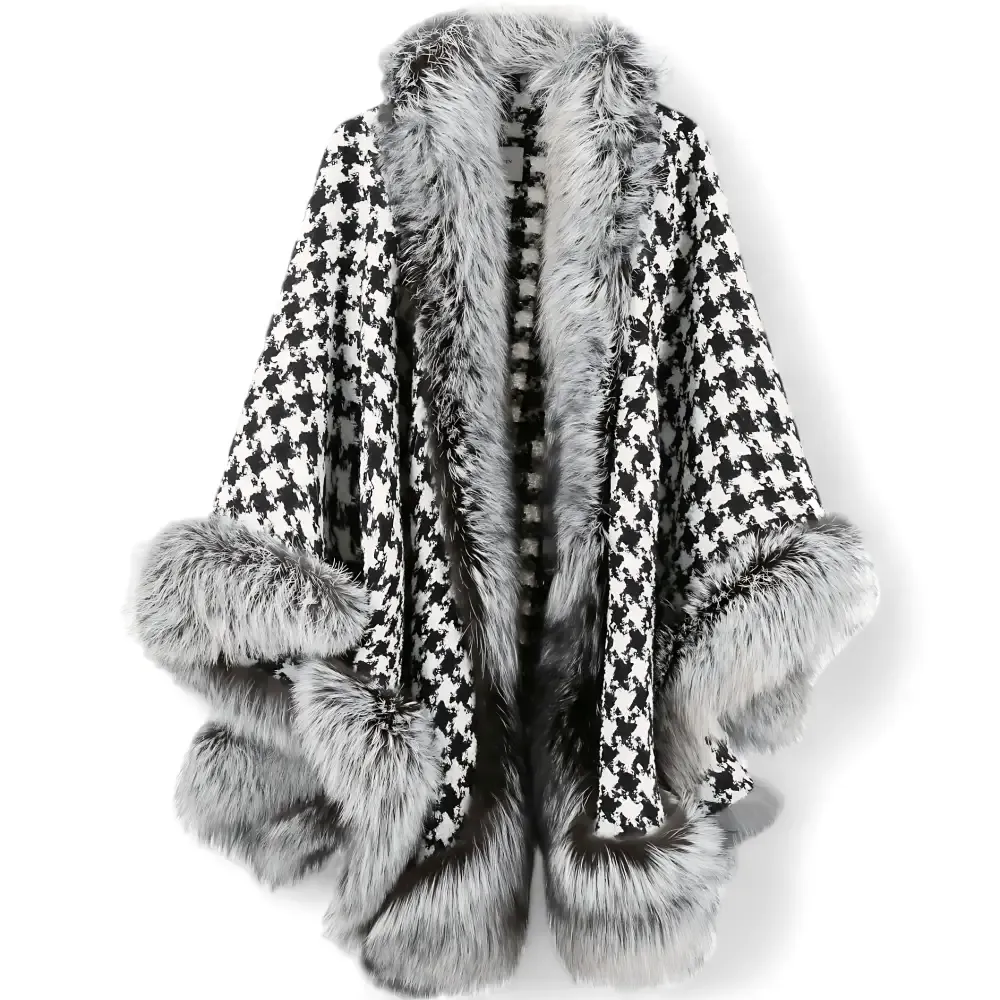Découvrez ce modèle de poncho manteau chic et tendance. À la fois moderne et élégant, avec sa doublure en fourrure. Ce poncho pour femme est confectionné dans un tissu de qualité qui se pare d’une belle couleur noire et blanche. Il est agrémenté d’un col rembourré et d’un fermoir également.